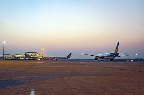 | 空は未だ明るいが、飛行場の施設も機体のポジション・ライトも点灯した。 |
