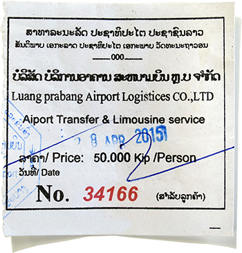 空港ビルの出口にあるタクシーチケット売場でチケットを買おうとしていると、機内で隣り合った若者の『ホテルまでのタクシーを二人で割り勘にしませんか?』との申し出。一人で50,000Kip(約755円)だが二人だと70,000Kip(約1,057円)、断る理由も無い。とりあえず彼から2USD受け取ったが、計算が合ってないぞ。