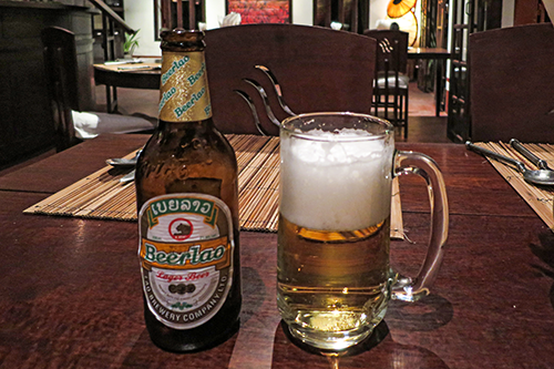 テーブルについて先ずはラオ・ビール(Beerlao)。ビエンチャンでもこればっかりだったな。
