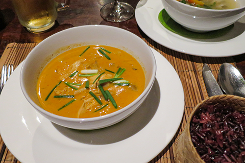 | ココヤシの香りタップリのカレーと赤米のカオ・ニャオ。 |