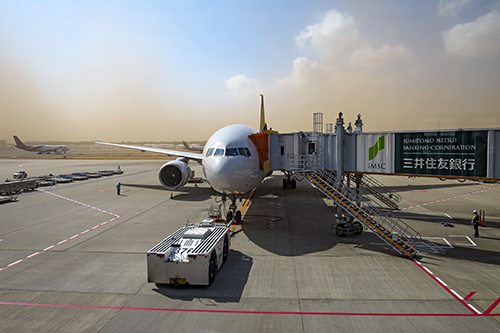 | 搭乗機の背後は折からの強風で舞い上がる千葉の黄砂。 |