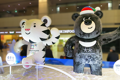 到着ロビーには2018年に開催されるピョンチャン冬季五輪のマスコット、ホワイト・タイガーの「ソホラン(Soohorang)/オリンピック」とツキノワグマの「バンダビ(Bandabi)/パラリンピック」が出迎えてくれた。