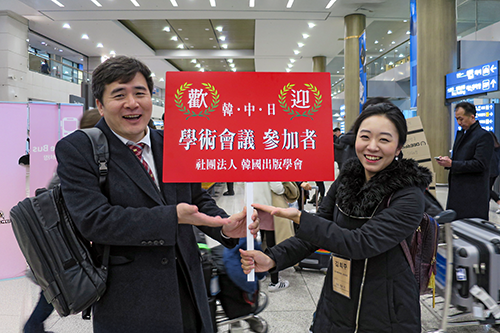 到着ロビーで赤い歓迎プラカード掲げていたのは韓国出版学会の Kwon, Ho Soon(権好順)さんと Kim, Hee Ju(金希柱)さん。
