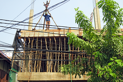 建設中のビルの周囲に足場らしいものは無く、上層階のコンクリートを打ち込むのに自然木の細い枝を並べて支えているのが珍しい。