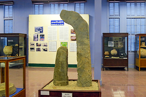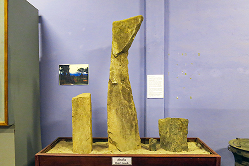 “MEGALITHIC CULTURES”(巨石文化)と題したパネルの前に、ラオス北部のフアパン県ヒンタン周辺にある巨石文化(メンヒル)の一部、立石(standing stones/メンヒル)が複数展示されている。