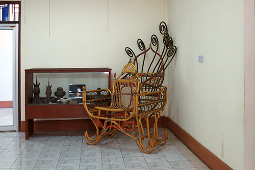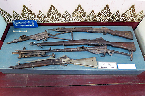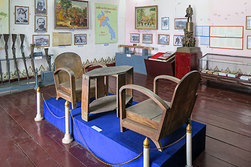 ラオス近代(入口には1945 - 1954とあった)の展示室にも銃器が展示してある。中央の青い台の上に展示されているのは「フランス侵略時代のスファヌボン王子の机と椅子」。