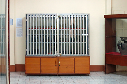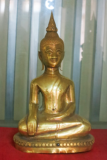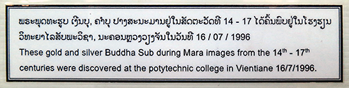 格子に貼り付けてある小さなプレートによれば、檻の中の像は『14〜17世紀の金および銀製の像が、1966年7月16日にビエンチャンのポリテクニック・カレッジで発見された』ものだという。