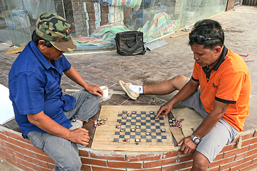 今日はよほどヒマなのか、トゥクトゥクのドライバー氏が歩道の脇でチェッカーをやっている。手作りのボードにビール瓶のキャップを駒にした熱戦は直ぐには終わりそうもなかった。