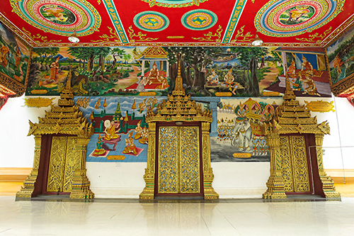 左右を獅子象に守られた本堂正面の階段を上がると、日本家屋の欄間に相当する部分に描かれている仏教の教えにまつわる壁画鮮がきれいだ。最近描かれたのではないかと思えるほど未だ色も鮮やか。本堂出入り口のドアの彫刻も豪華で見事。