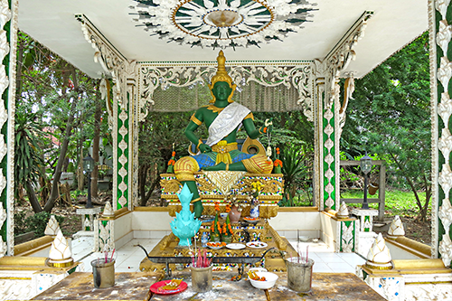銀色のお堂に祀られている緑色に彩色された座像、左手に三鈷はないが座り方といい頭の被り物(宝冠?)といい、門の上の座像によく似ている。バンコクに行ってしまった翡翠仏を模したものか?
