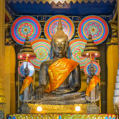 この寺院の名前の由来になったと伝わる中央の仏像はその左右に二体の仏像を従えている。