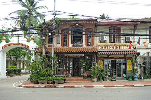 インドシナ手工芸品 (Indochina Handicraft) 店とシルクスクリーンのポスターを売るギャラリー (Carterie du Laos) の左に見える白い門がワット・ハーイソーク。
