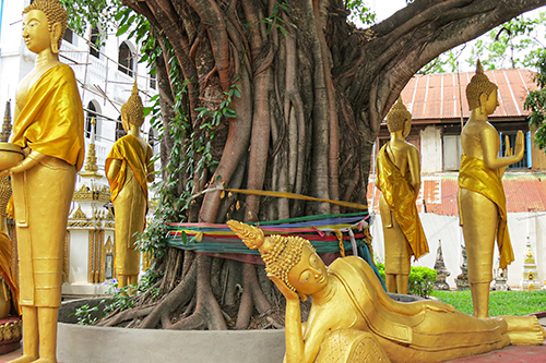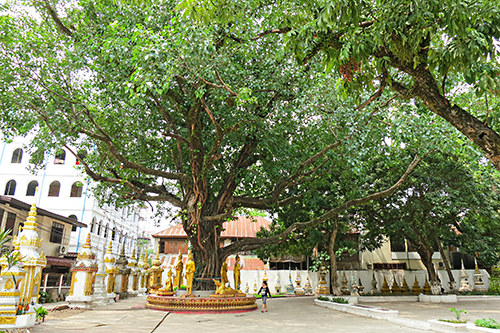 境内の奥に大きく枝を張った木が一本、菩提樹か? 幹の周囲を金色の仏像が囲んでいる。