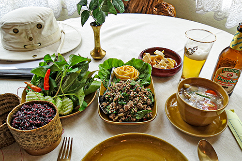 豚肉のラープ48,000Kip(約576円)を頼んだのだが、カオ・ニャオ10,000Kip(約120円) がないとすこし塩味が強い。