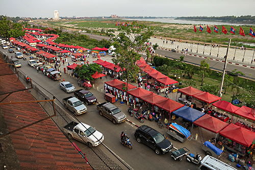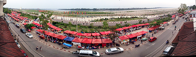 ビエンチャンに着いた日に歩いてみたナイトバザール、今夜は上から赤いテントの列を眺めるのみ。テントが川に沿って並んでいるのが見下ろせる。
