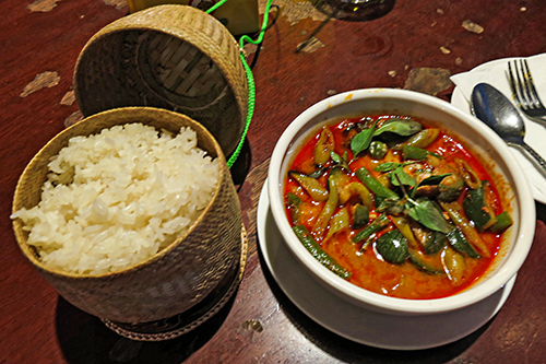 レッドカレー(野菜)25,000Kip(約300円)とカオ・ニャオ7,000Kip(約84円)を注文する。バーのカレーなので期待していなかったのだが、このカレーが秀逸。辛さも辛いのだが、それ以上に野菜の甘味が利いていてカオ・ニャオにピッタリだった。