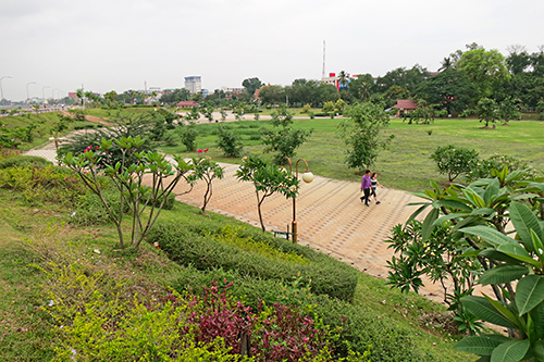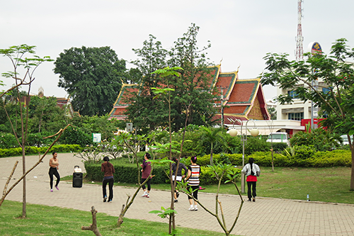 朝の散歩がわりにファーグム通りと河川敷に挟まれたチャオアヌウン公園(Chao Anouvong Park)をゆく。