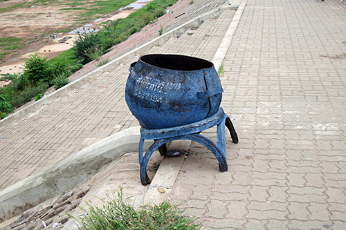 公園の外れ、メコン川の土手に点点と置かれている釜のようなものはゴミ入れ。