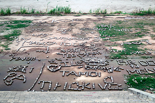 河川敷に下りる階段の下に崩れかかったブロックによるメッセージが並んでいる。護岸工事の際に使われたブロックの残材が河川敷に山積みになっているのでそれを利用したものだろう。