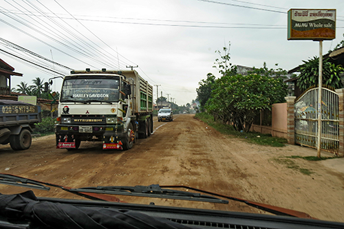 友好橋のロータリーを出ると直ぐに未舗装の赤い道に変わる。大型トラックやトレーラーも通っているので道路の痛み方がひどく大きな凹みが続く。