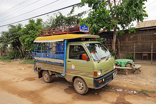 荷台には先客が一人と野菜が入った大きな籠が乗っている。往復料金80,000Kip(約960円)を運転手氏に渡して、ギシギシと軋むドアから助手席に収まる。