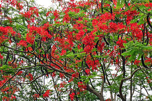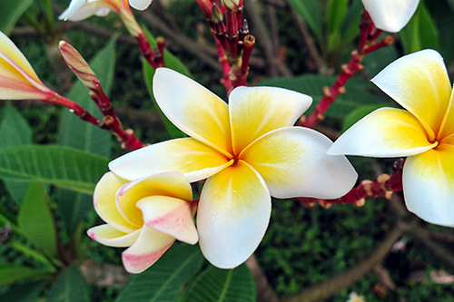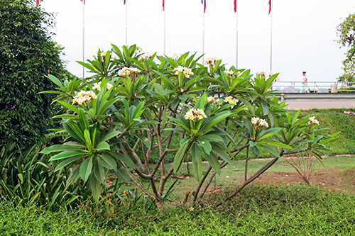 遊歩道の植え込みに並ぶ未だ若いJampaの木が白い花をつけている。