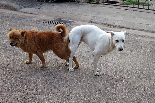 ワット・インペンの境内を通り抜けて細いインペン通りに入ると、子供の頃に見たのが最後の記憶だろう、それ以来、長いこと目にしたことがない犬の交尾に出会った。