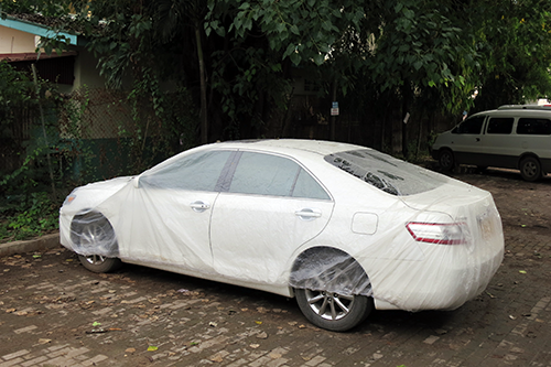 病院内の駐車場に薄いビニール製のカバーでスッポリ覆われた車が停めてあった。