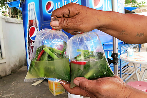 野菜を売る屋台にパンパンに脹らんだビニール袋が沢山並んでいる。中身は漬け物のようだが、店主に声をかけると手振り身振りを交えて、どの家でも食事には欠かせないものだと言っているようだ。