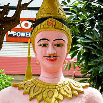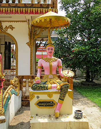 口ひげや襟飾り、腕輪などがあるのでラオスにゆかりのある王か王子像ではないのだろうか。台座には銘板が嵌め込まれているがラオ語のみで読めず。