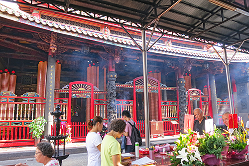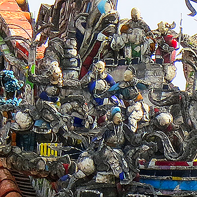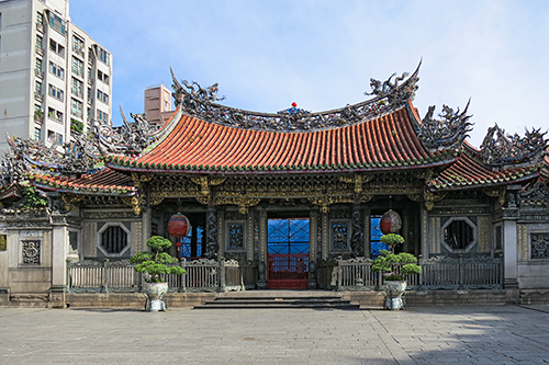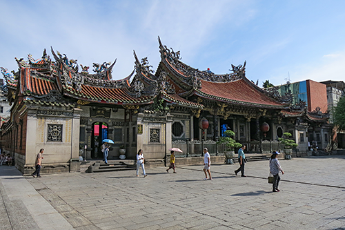 山門を入ると人だまりで、正面に福建省泉州の名工・王益順が1920年に建てた三川殿がある。三川殿に連なる左が虎門廰、右が龍門廰。龍門から入って虎門から出ると言われるのは高雄の左営蓮池潭の龍虎塔と同じ。