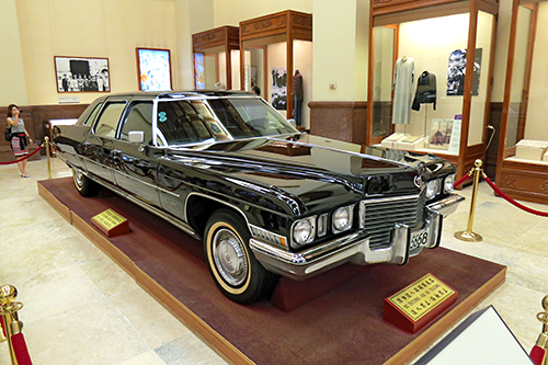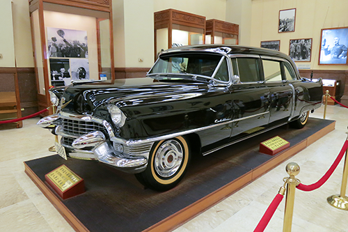 左側に展示されているのは1972年製のキャデラック。4ドア・7人乗り・L632 x W208 x H150cm・重量約2トン・使用期間1972 - 1975。