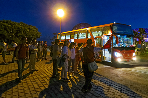 すっかり暗くなった中、駐車場に停まったバスを降りて徒歩で琵琶湖へ。既に暗くなっているのに湖の見学に行く?