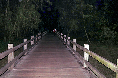 道々街灯はなく、ガイド氏が掲げる懐中電灯を目印に暗い中を進む。こんなに暗いのに見に行く琵琶湖は照明に照らされてきれいなのだろう。