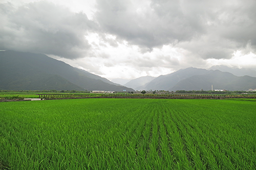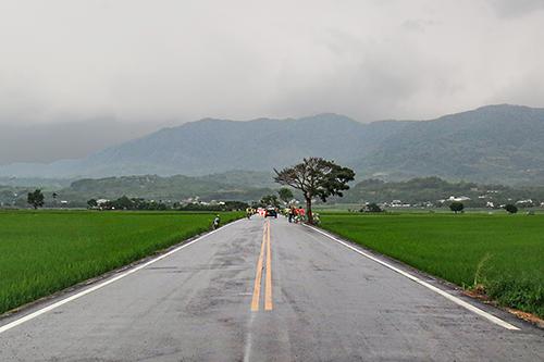 日暉国際渡暇村から1.5km余りか、池上郷の水田の真ん中を走る一本道「伯朗大道」には電信柱がなく晴れていれば広々とした見通しいの良い風景だろう。
