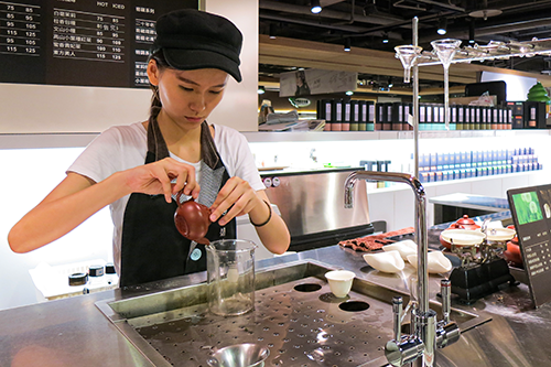 小さな急須に秤で量った茶葉を入れ、カウンターの手前に立っている給湯栓から湯を満たして手元のビーカーに茶を注ぐ。ビーカーが一杯になるまでこれを繰り返して適量になったところでテイクアウト用のカップに移してくれた。
