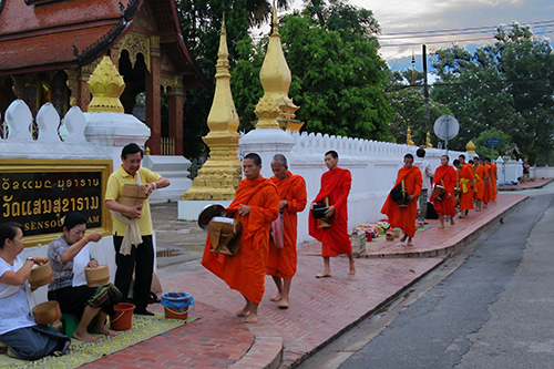 午前六時前に寺院の白い門からオレンジ色の相違を纏った修行僧の列が出てきて、朝の托鉢が始まった。