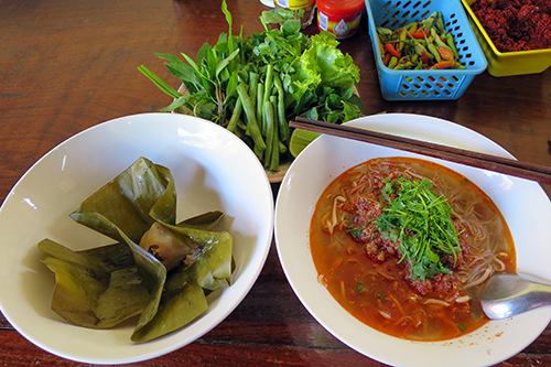 宿の隣のラオ麺屋でカオ・ソーイ(Khao Soi)20,000Kip(約302円) とラオス粽 10,000 Kip (約151円)を注文。粽は香草味の甘いデザートのようだった。カオ・ソーイは見たとおりのピリ辛、別皿でタップリの香味野菜もついてきた。寝起きの朝食には好い。