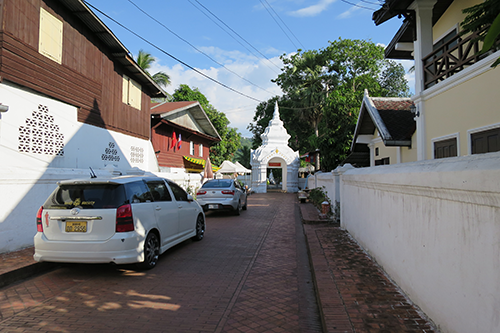 ワット・シェントン(Vat Xienthong)の正門はサッカリン通りを半島部で回り込んだメコン川側なのだが、サッカリン通りを徒歩で150メートルほど行ったところに通用門があった。
