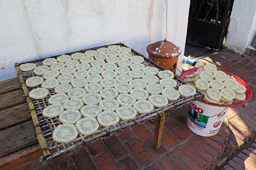 | 天日干しの丸くかたどったカオ・ニャオ。 |