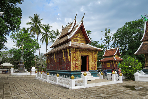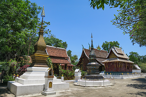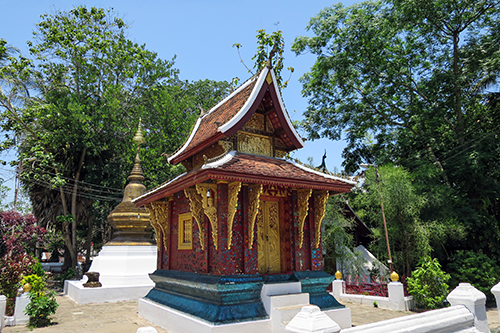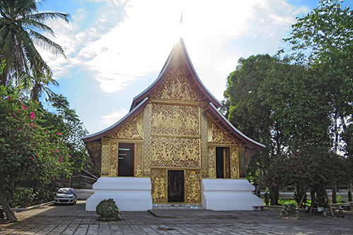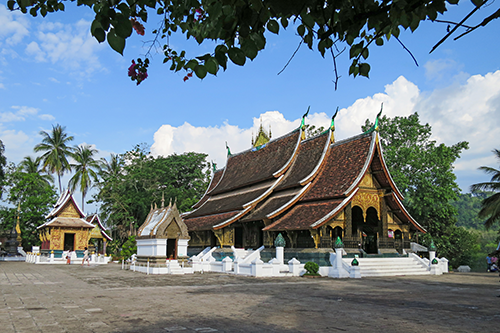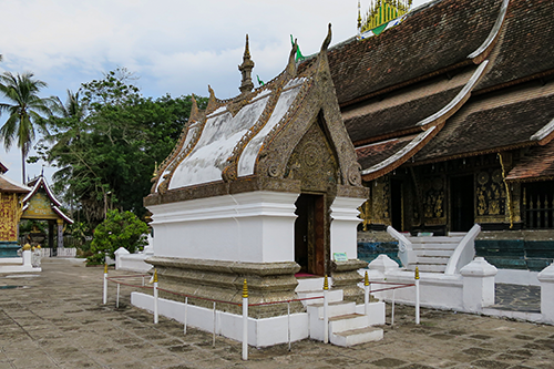 手前から二層、二層、三層と重なる本堂の屋根は、ビエンチャンの寺院に比べるとゆったりしたカーブを描き、その勾配も緩やかなルアンパバーン様式。基壇の白とのコントラストも鮮やか。