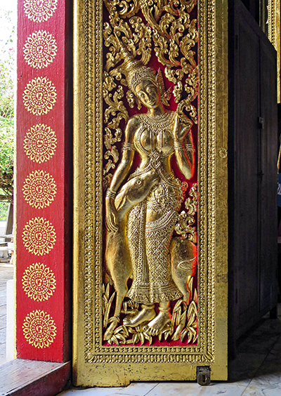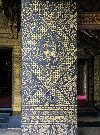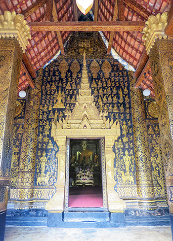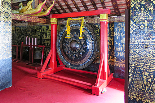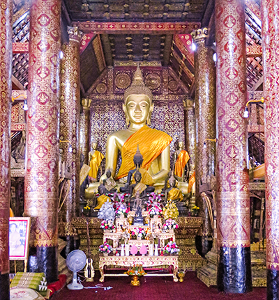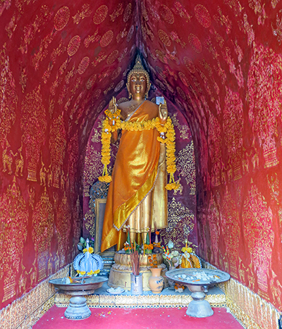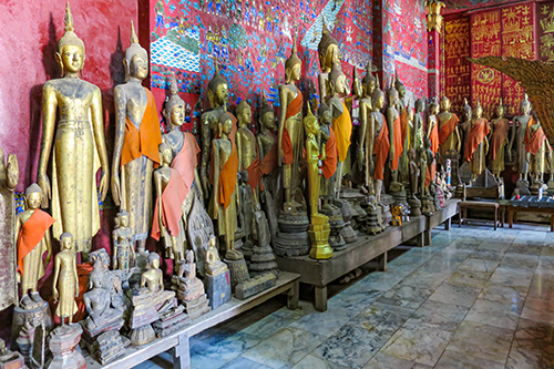 霊柩車の周囲の壁際には霊柩車を見守っているように大小の仏像が並んでいる。ここの仏像はどれもみんなホッソリしているが、ルアンパバーン様式の特徴なのだろう。