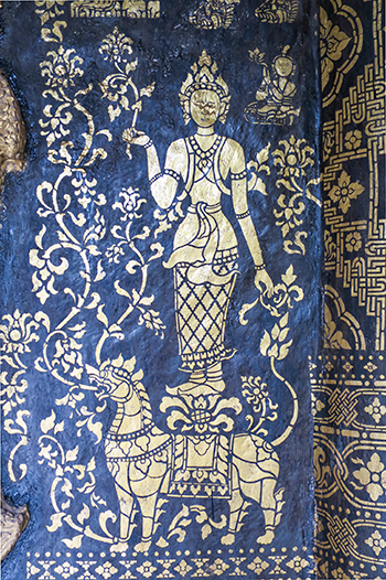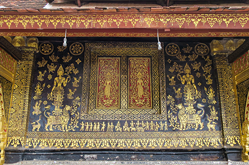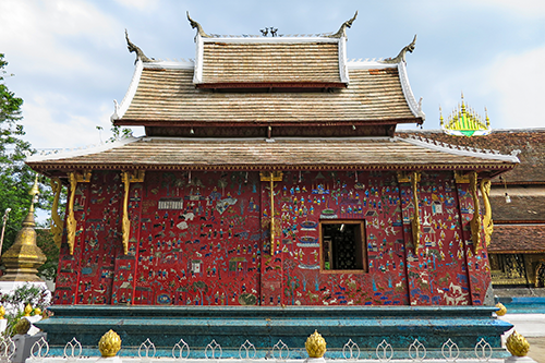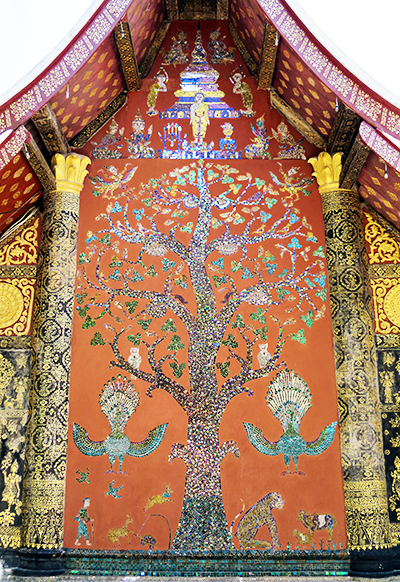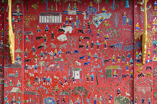赤堂の壁には細かなモザイクでラオスの田園生活の様子が描かれている。
