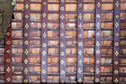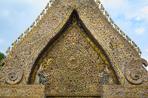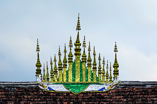 本堂の屋根、中央に載っている飾りは宇宙を象徴しているというドクソーファー(Dok So Far)で、尖塔の数が寺院の格を表している。