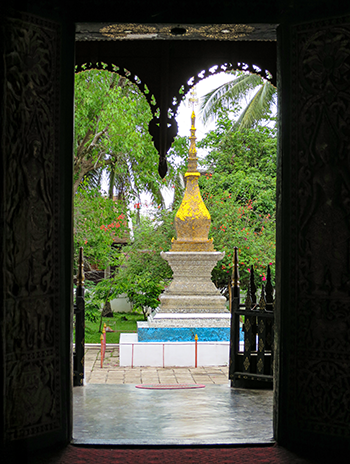 門の前でカオ・ニャオを小鉢のような形にして天日干ししている。ルアンパバーン滞在中に民家の近くでも良く見かけたが、仏様へのお供え用なのだろうか。