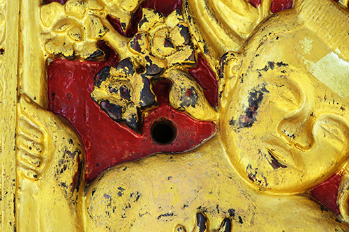 | 本堂正面で屋根を支える柱に施された模様。 |