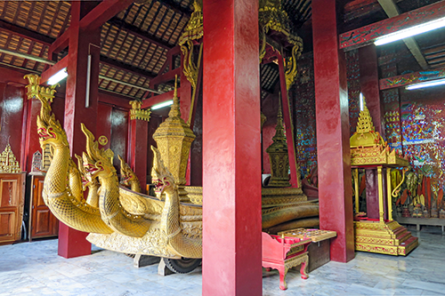 庫内の中央に真っ赤な四本の柱に挟まれて、六頭の龍(ナーガ)に守られた金色の霊柩車が安置されている。