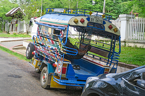 ルアンパバーン世界遺産局の前に停めたトゥクトゥクの中では、運転手がハンモックに揺られて朝からお休み中。
