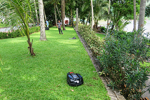 半島部の突端にある公園では芝刈りがロボットが仕事をしていた。ロボット型掃除機の芝刈り機だ。側に人が付ききりというのが笑える。
