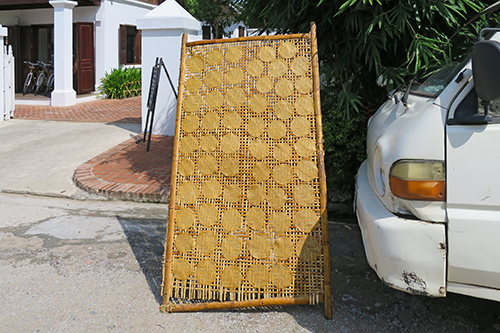 門の前で煎餅のようなものを天日干ししている。これも油で揚げて、寺の行事にでも使うのだろう。